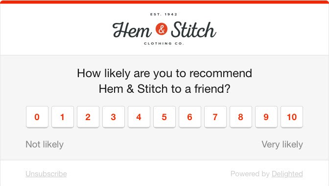 There's a bunch of survey apps out there, so here we'll look at how we can integrate with one of them. In particular, we'll look at integrating with Delighted, which is a popular option. You've likely received a survey from Delighted when purchasing from an online storefront, or from an online service provider.