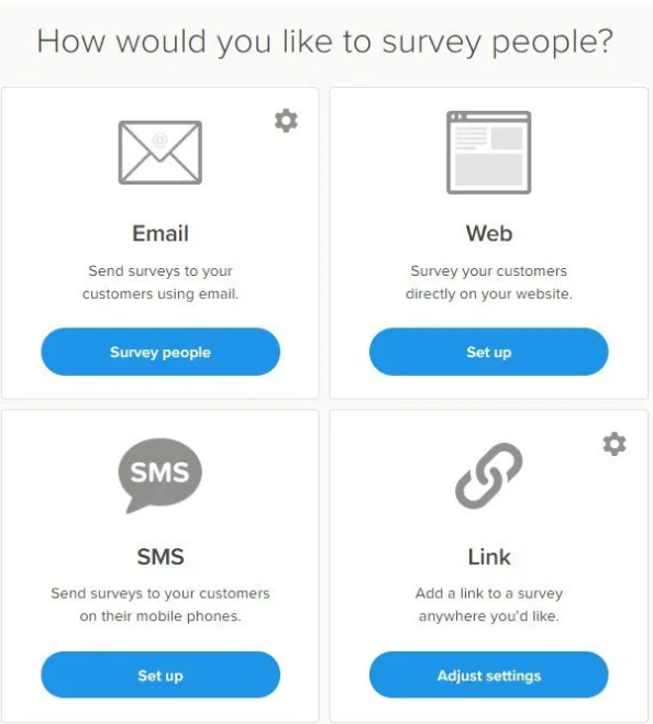 Delighted has a number of ways to send a survey, including Email, Web, SMS, and adding a Link.