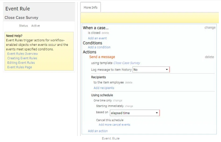 So, when the case is closed, the event rule will fire, and it will send an email to the employee