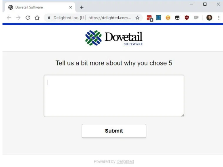 Once the employee clicks one of the 1-5 numbers, that navigates them to the Delighted site, records their score, and then asks for more details on why they chose the number that they did.