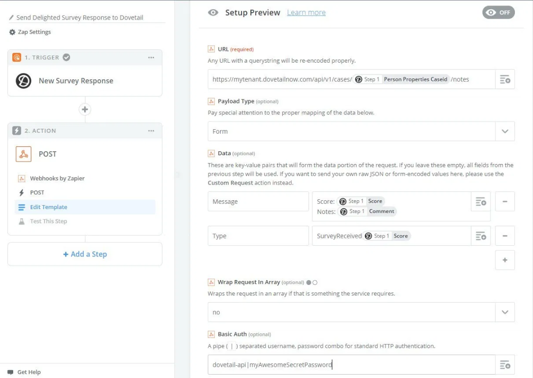 - The Basic Auth needs to be a username and password for accessing your Dovetail app. I created a specific dovetail-api user.