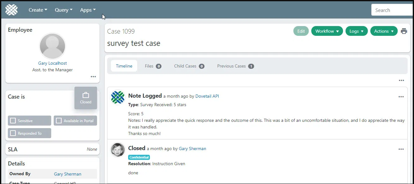 Notice how the Note on the case has the Type (Survey Received: 5 stars), and the Comments from the employee.