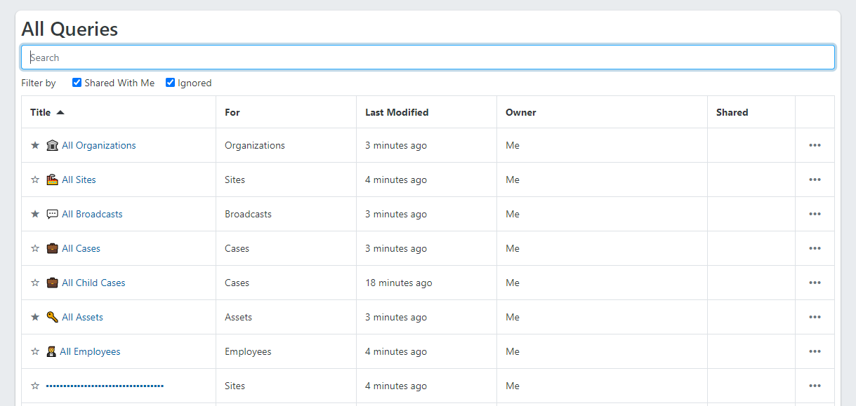 - The Search box allows for filtering down the list of queries. Search by title, entity type (cases, solutions, sites, etc.) and owner.