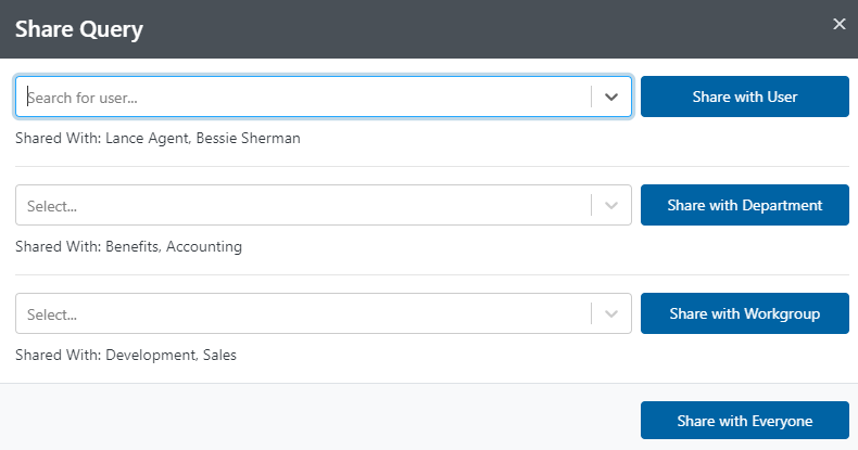 Queries can be shared to individual users, everyone in a department, everyone in a workgroup, or to everyone in the system.