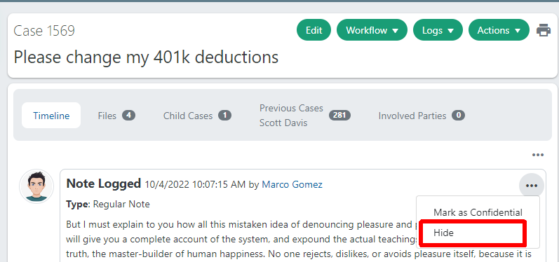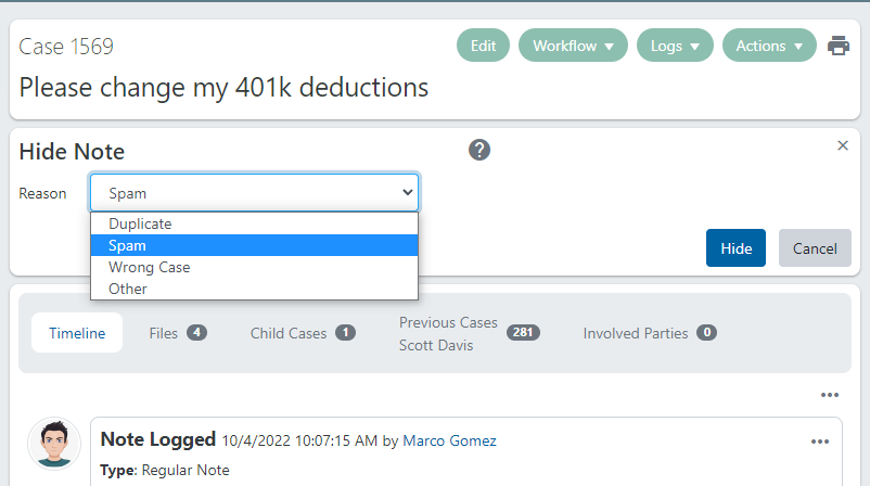 However, there are times when a note or email should be hidden - such as if it was logged to the wrong case, it contains sensitive information, or it is spam.